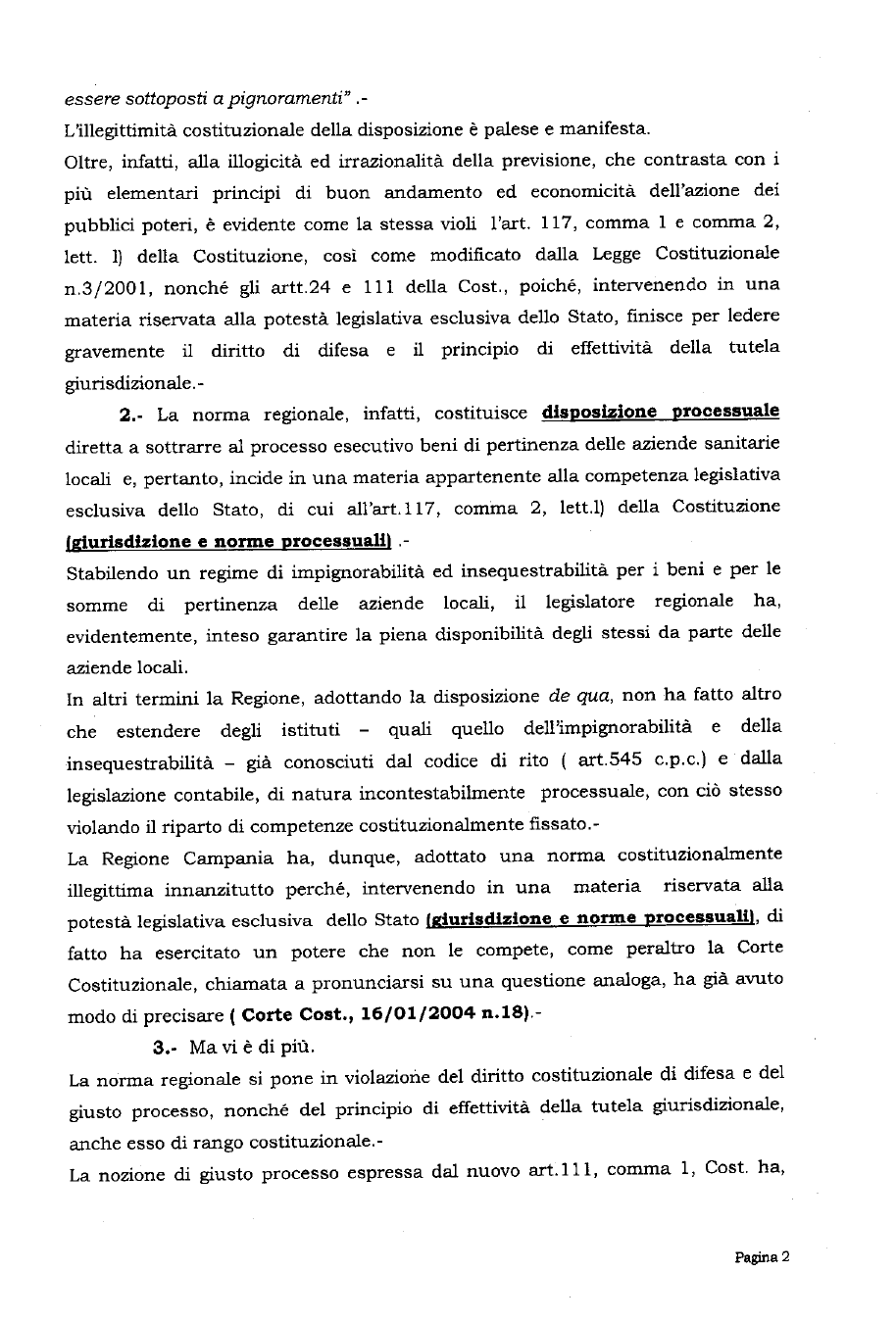 Giova ricordare che l’art. 25 della Legge Regionale 1/2009 inibisce le procedure giudiziarie di pignoramento dei fondi presso le Aziende Sanitarie Locali e le Aziende Ospedaliere ed Universitarie.