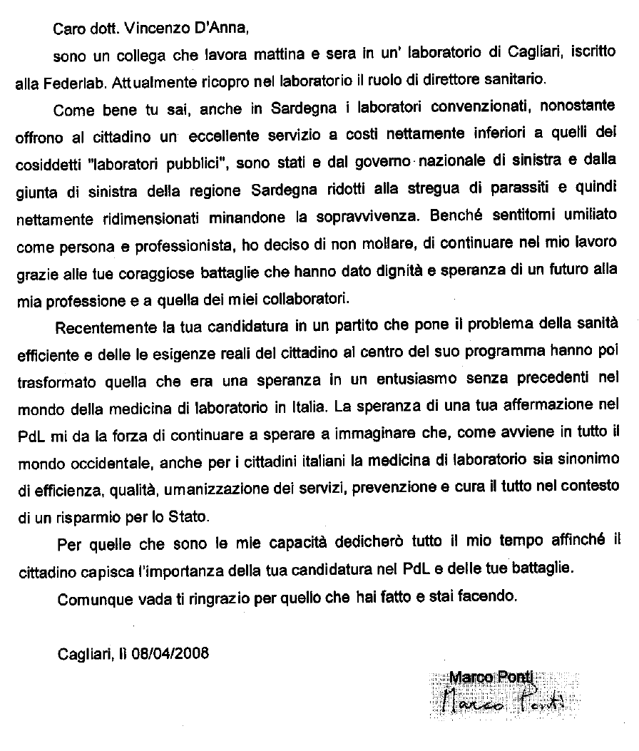 Lettera al Presidente di FederLab Italia Dott. Vincenzo D'Anna da un Collega di Cagliari.